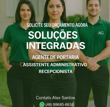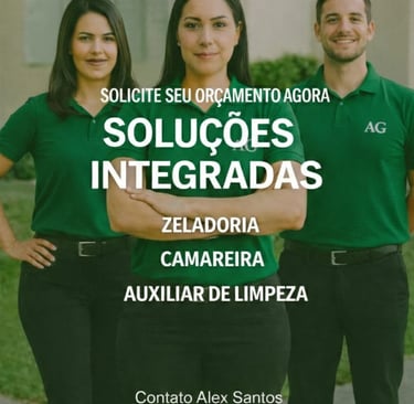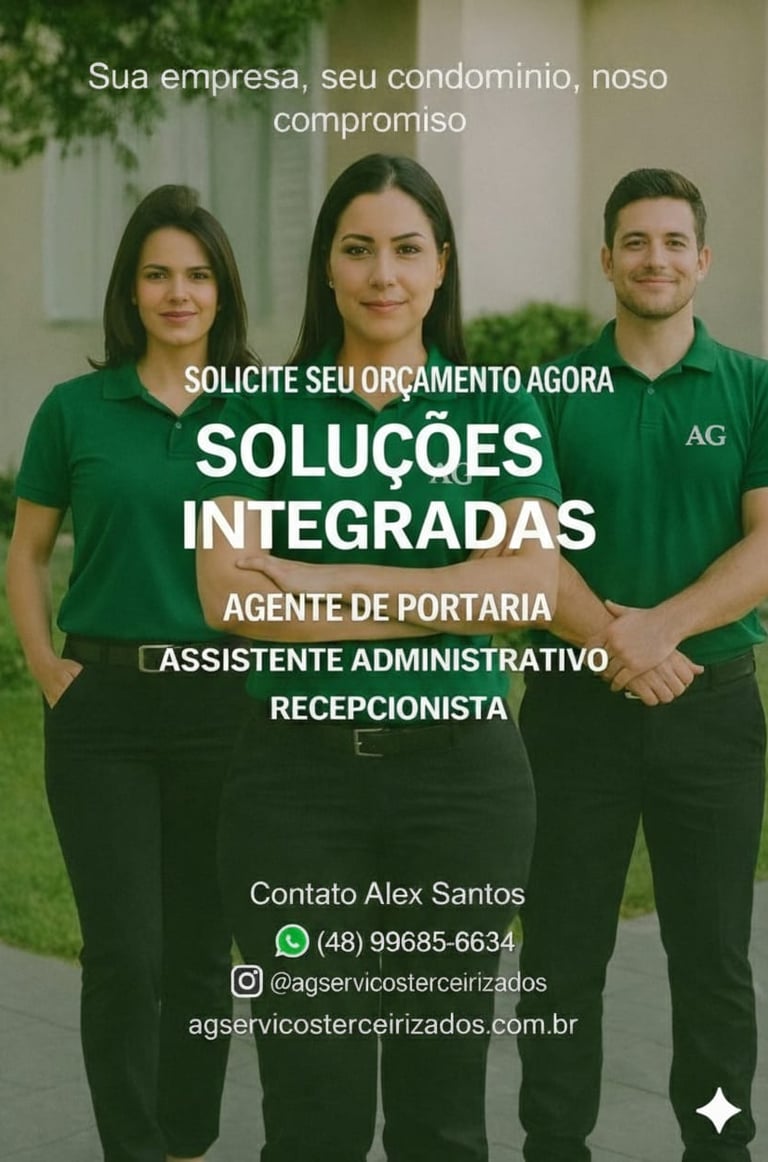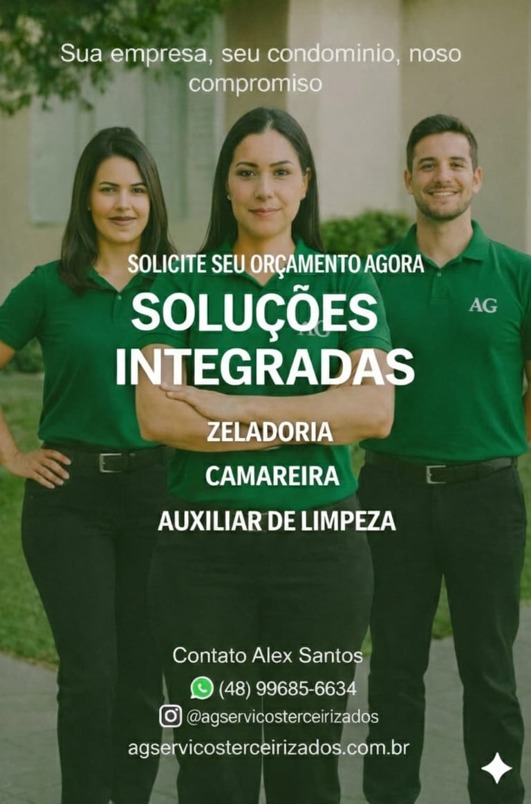A AG Serviços Terceirizados oferece soluções integradas em Portaria, Recepção, Assistente Administrativo, Camareira, Zeladoria, Auxiliar de Limpeza, Manutenção e Conservação, garantindo ambientes organizados, funcionais e seguros, sempre com excelência, responsabilidade e compromisso com a qualidade dos serviços prestados.